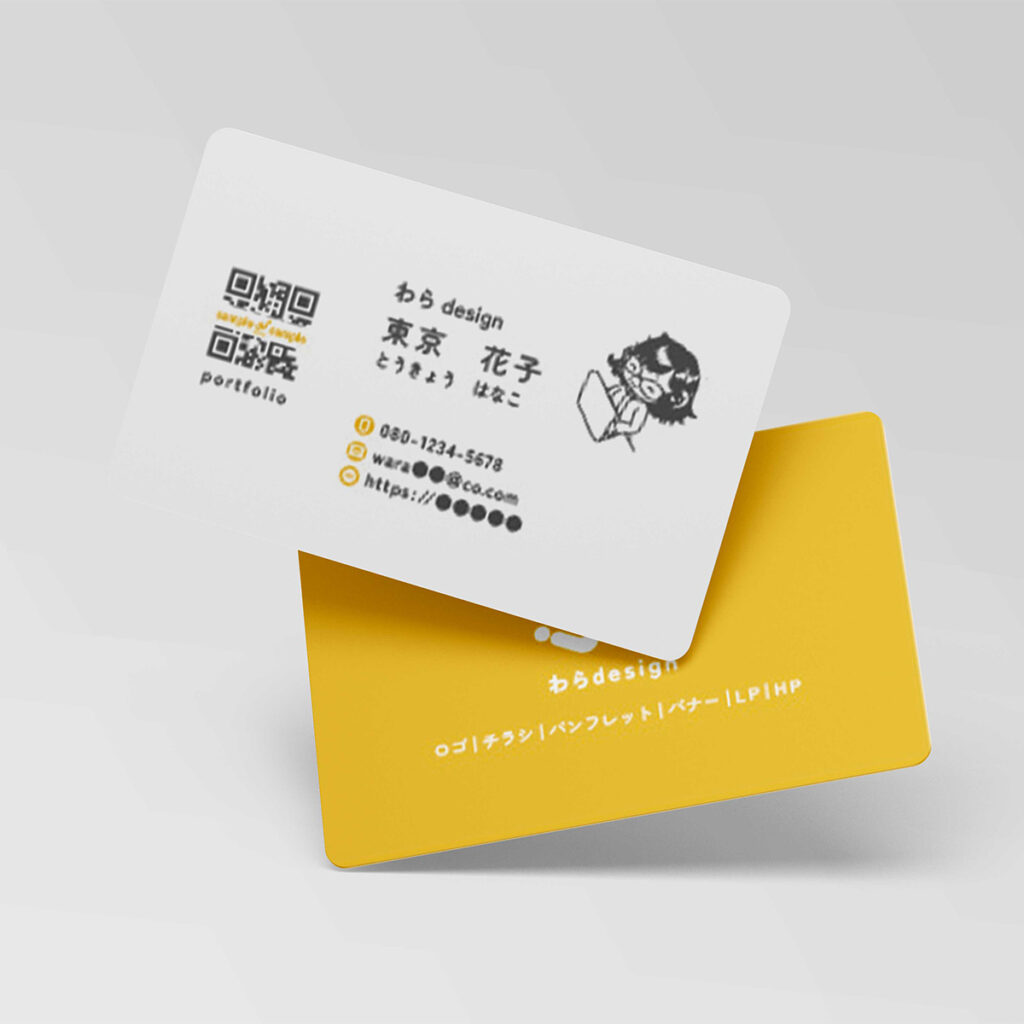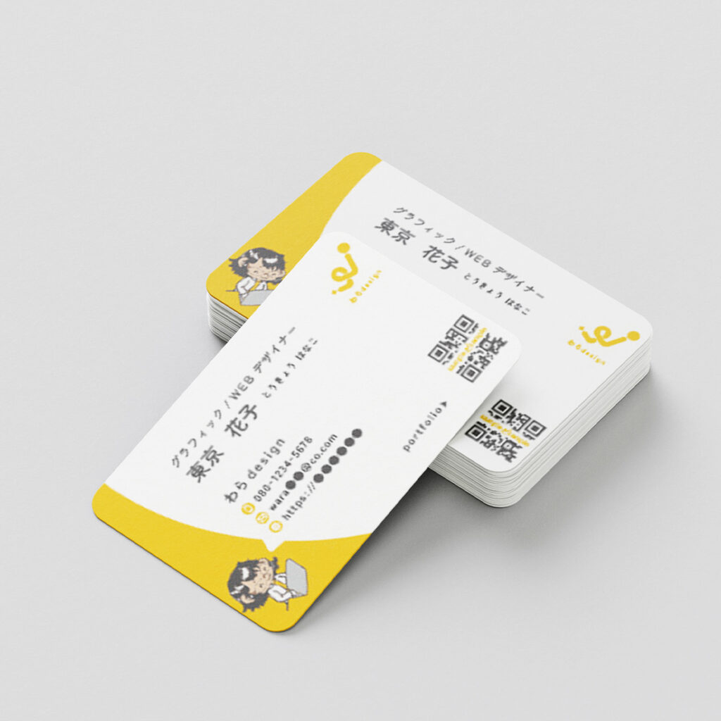 ロゴの柔らかさを活かした名刺顔を覚えていただけるように似顔絵も配置親しみ安さを感じていただくと共に文字の読みやすさを意識しました。ロゴと文字を合わせ、背景に吹き出しを配置しイラストが自己紹介をしているように作成しました。