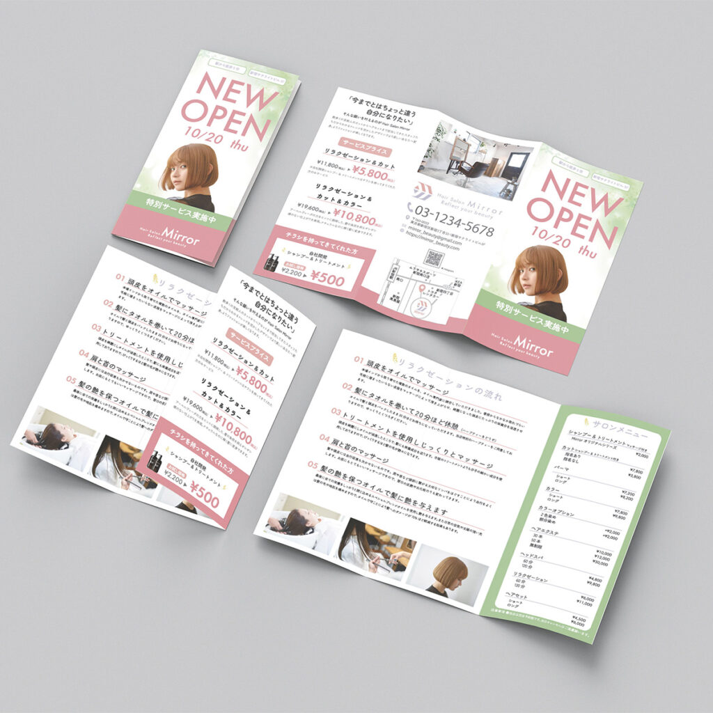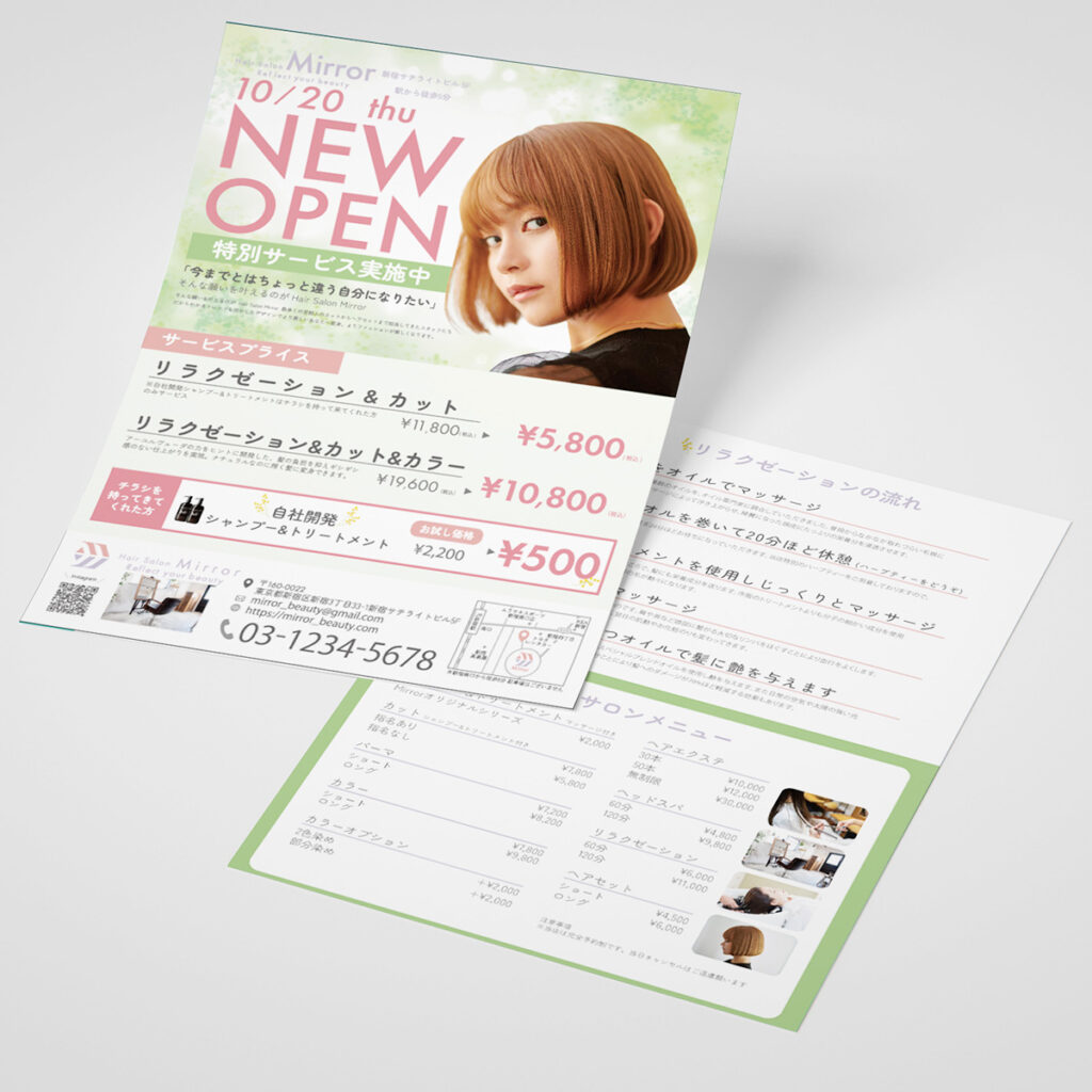 チラシと合わせたボタニカルな印象ロゴと合わせた柔らかいデザインチラシと合わせ緑を主体に表紙にNEWOPENとオープン日を入れることで目につきやすく、ロゴと合わせたピンク色を大きく入れ白文字で店名を入れることで店名の印象も残るよう工夫しました。
