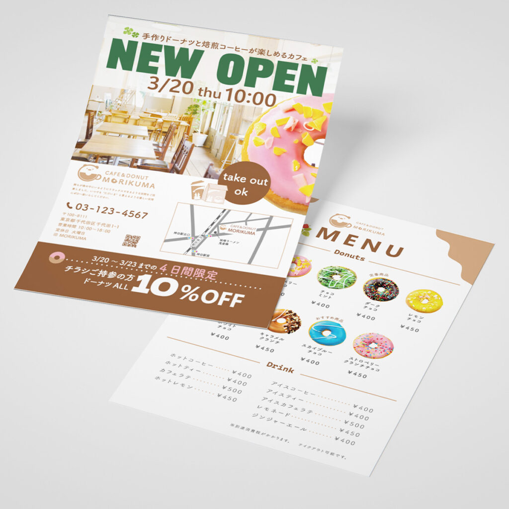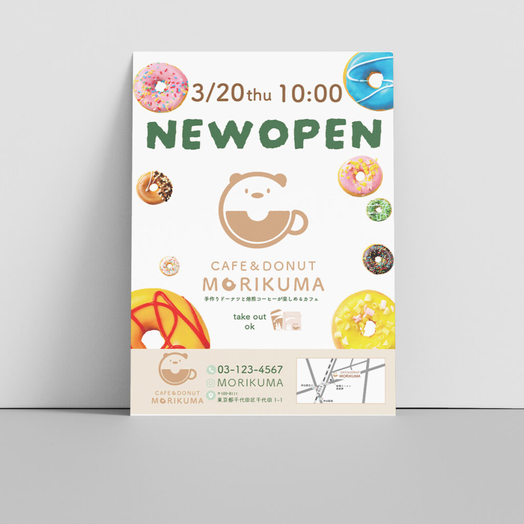 NEWOPENの文字とカフェのロゴ、店名が目に入るように作成しました。自慢のドーナツを随所に配置し、美味しそうで楽しそうな雰囲気を出しました。女性が経営されているとのことで可愛らしく柔らかい雰囲気を目指しました。