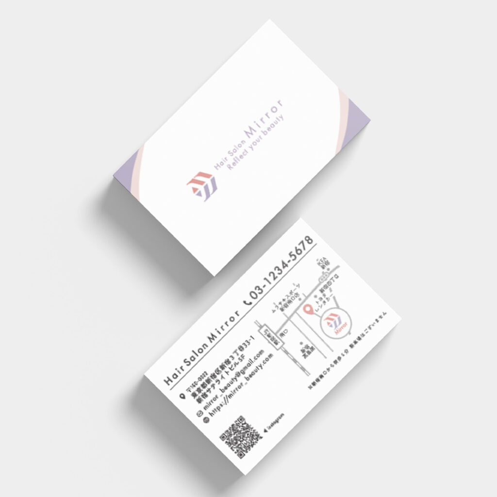 鏡に映るを意識したデザインロゴと合わせた柔らかい色合い柔らかい印象を持ってもらうために文字も真っ黒ではなく濃いめの灰色で統一し、表面にはMirrorの店名を表した鏡が光っているような装飾を施しました。