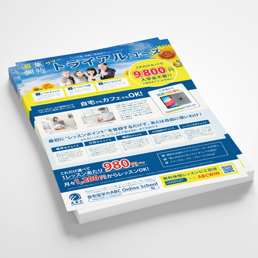 夏らしさを表しつつターゲットの大人に響くデザインロゴと名刺に合わせた青色を基調に夏らしいヒマワリを添えヒマワリに合わせた黄色を使いました。色の種類を多くしてしまうとターゲット層が若い層になってしまうため、色の種類を最小限に抑え、落ち着いた印象のチラシに仕上げました。
