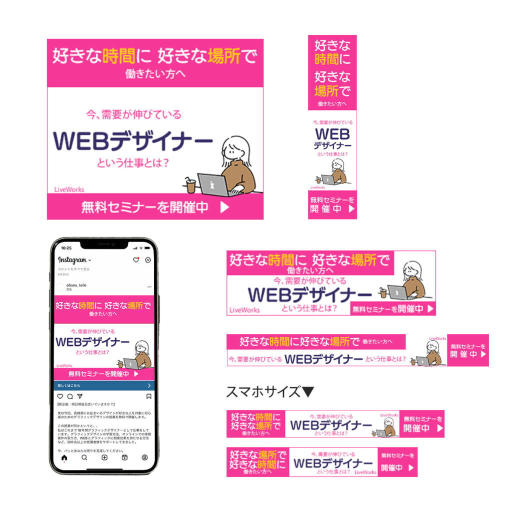 Webサービスのバナー waradesign / 2025年2月24日 ターゲット層:20~40代主婦向けバナーの飛び先:お客様のLPInstagramやLINEなど様々なところで掲載されるとの事20代を主にターゲットとして設定し、ビビットなピンク色を使う事でどんな所に掲載されても目が行くように作りました。