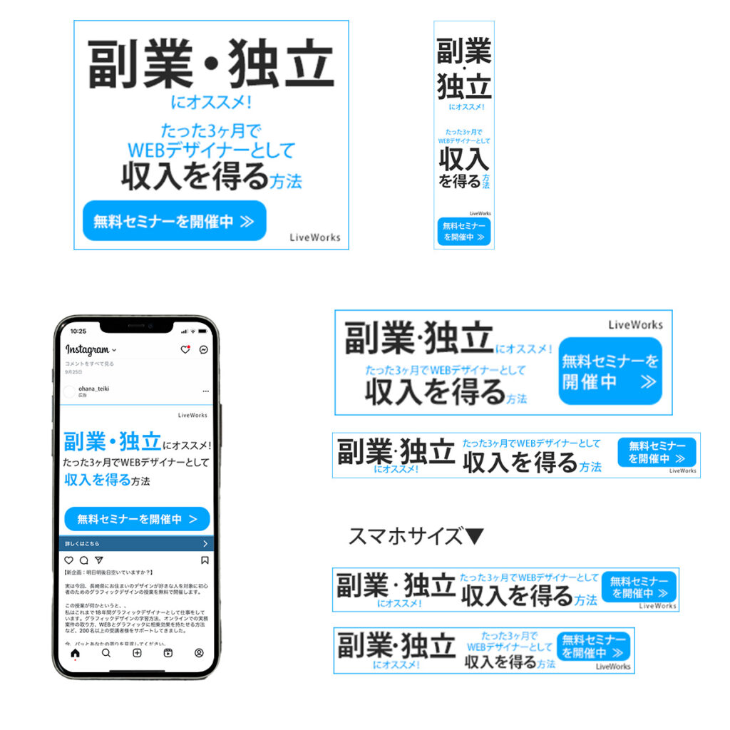 Webサービスのバナー waradesign / 2025年2月24日 ターゲット層:20~40代男女バナーの飛び先:お客様のLP男女がターゲットとのことでしたが、少し強めの文章だったため男性を主にターゲットとして定め作成いたしました。インパクトを出すため太めのゴシック体を使用し、爽やかな水色を採用し固くなりすぎないように制作しました。